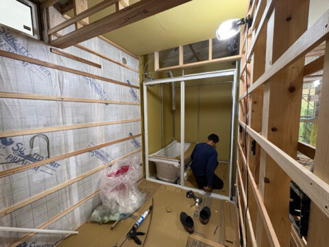 ↑内部の壁の仕上げを解体後、既存の筋交いを確認し、必要な壁倍率になるように補強していきます。