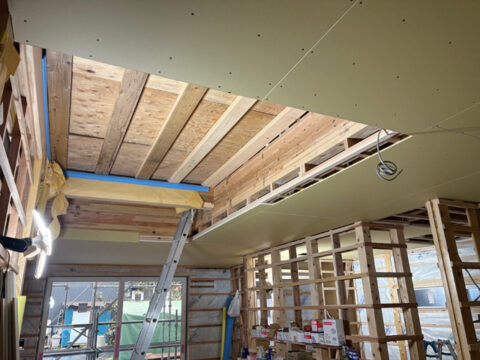 9月に建て方を行った鯖江市I様邸では、天井下地をしています。この後杉羽目板を施工します。真ん中の下地をしていないところは、今は作業がしやすいように塞いでいますが、吹き抜けになります。