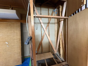 既存筋交を確認後、金物での固定と追加で新しい筋交を施工していきます。