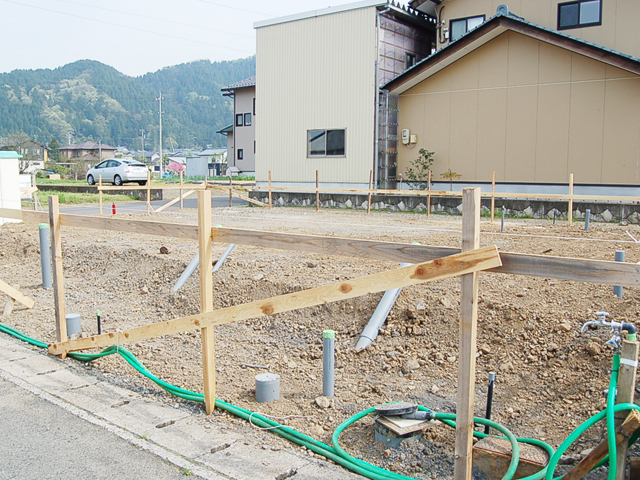越前市 Y様邸 基礎工事 2014.10.09 家づくり日誌 地盤改良工事、配管工事を終えたY様邸では、基礎工事入っています。 今回の基礎には犬走り(建物の外周部に、雨水が建物に浸透しないようにコンクリートを設けたものです。)を施工します。建物自体の坪数も大きいですが、犬走りを設けることで一回り大きく感じます。