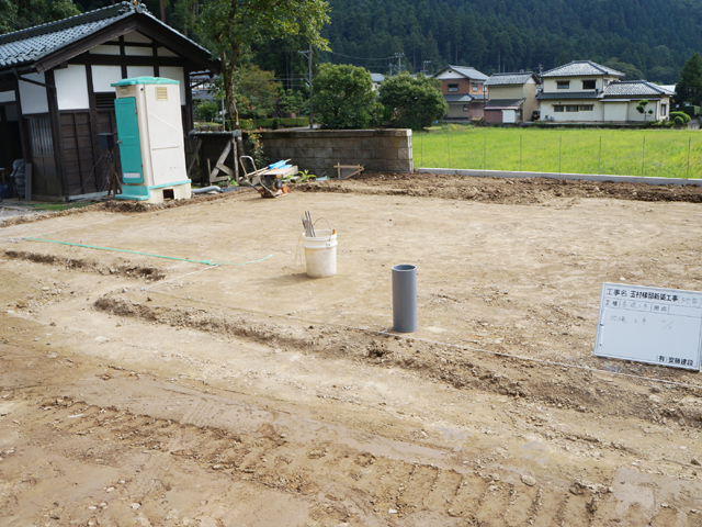 鯖江市 T様邸 外構工事 2014.08.22 家づくり日誌 基礎型枠が外れました。敷地の形状によって住まいが完成してしまうと重機が入れない所がありますので、先に外構工事に入っています。 まずは、整地して、防草シートを敷きます。その上から硅石を敷いていきます。硅石から頭を出している配管は、余分な部分のみ後で切っていきます。 防草シートは光を通さないので草を生やし難くすることができます。また、硅石を踏むとジャリジャリと音をたてますので、防犯にも一役買います。見た目の綺麗になりますので、防草シート+硅石は一石二鳥かもしれないですね。