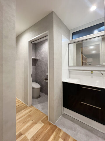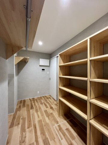 ↑キッチンを中心に、パントリー・洗面・ファミリークロークをぐるりと一周できる動線で設計しているため無駄な歩数を減らし、家事も効率よく行うことができます。
