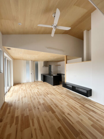 ↑足元には心地よい肌触りのカバザクラの無垢の床材。見上げればシナベニヤ天井の優しく美しい木目が広がります。