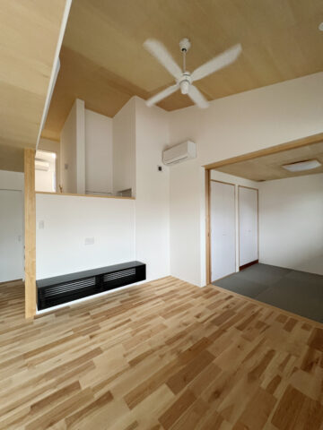 機能的な「回遊動線」と、空間を縦に活用した「スキップフロア」、素材の温もりを感じる「シナベニヤ天井&無垢の床」、