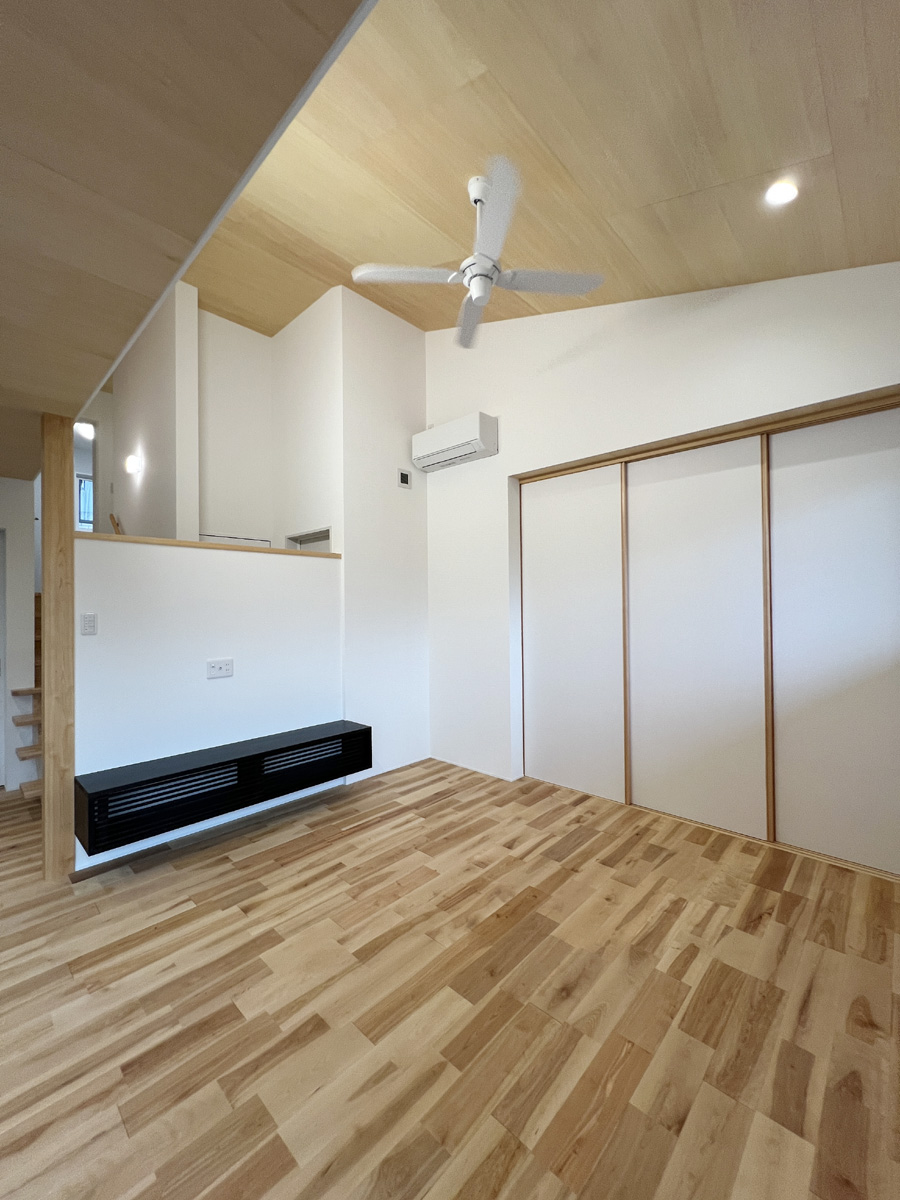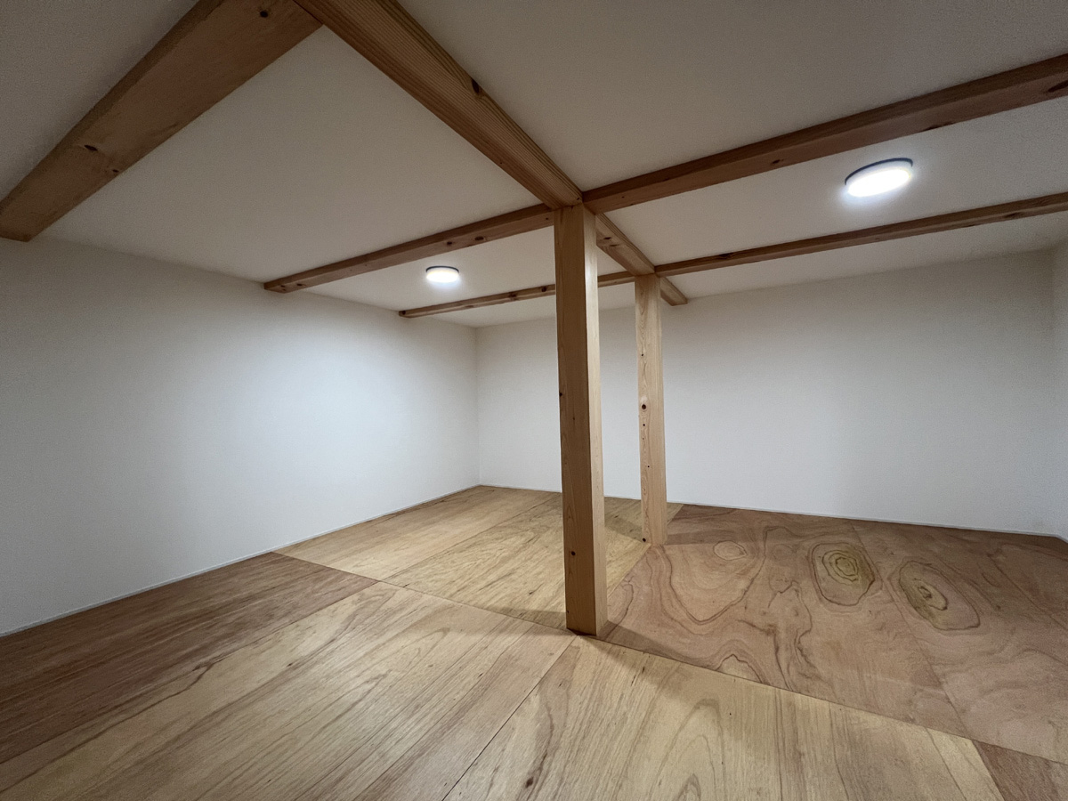 上部は、リビングから少し距離をおいた落ち着きのある寝室として。そしてその下部は、季節のものや大型用品も丸ごと収まる大容量の床下収納として活用しました。下部の収納は固定資産税のかからない1.4メートルの高さにしています。