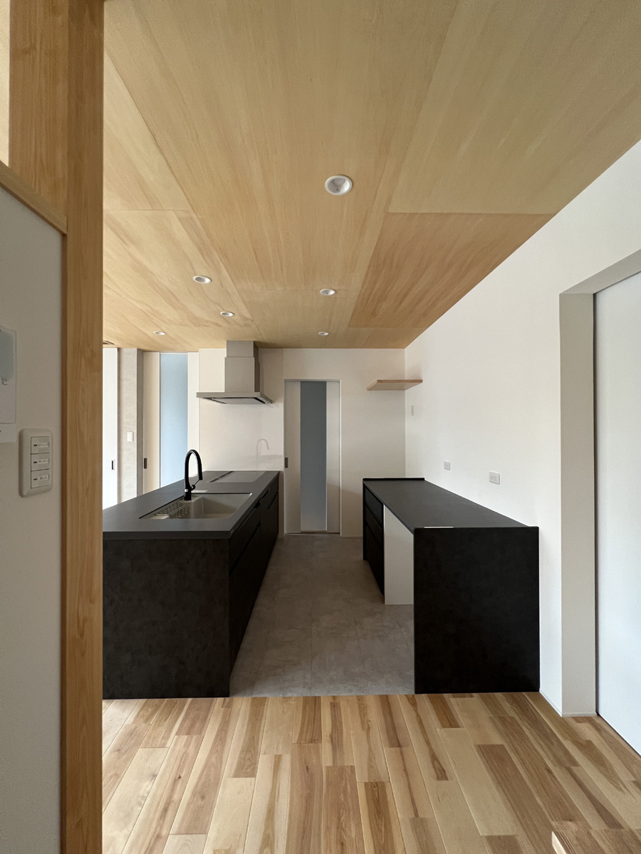 平屋をご希望されていたお施主様の「LDKが広々とした住まいにしたい」というご要望や「平屋にすると収納スペースが足りなくなるかも・・・」というご心配から、スキップフロアを取り入れた間取りをご提案させていただきました。スキップフロアの下に大容量の収納スペースを確保できたことで 普段使いの収納スペースや家事動線がすっきりとまとまった暮らしやすい間取りになりました。LDKはスキップフロアの高さを生かし広がりのある空間となっています。