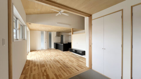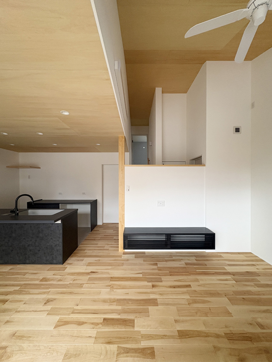 機能的な「回遊動線」と、空間を縦に活用した「スキップフロア」、素材の温もりを感じる「シナベニヤ天井&無垢の床」、