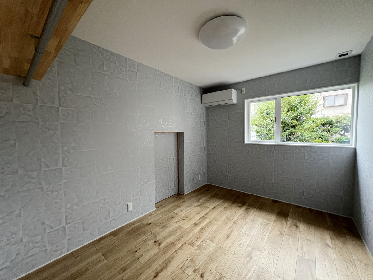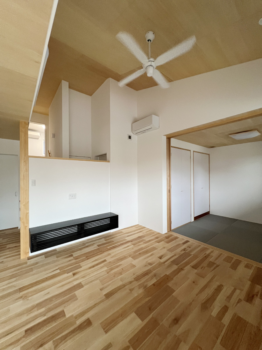 ↑足元には心地よい肌触りのカバザクラの無垢の床材。見上げればシナベニヤ天井の優しく美しい木目が広がります。